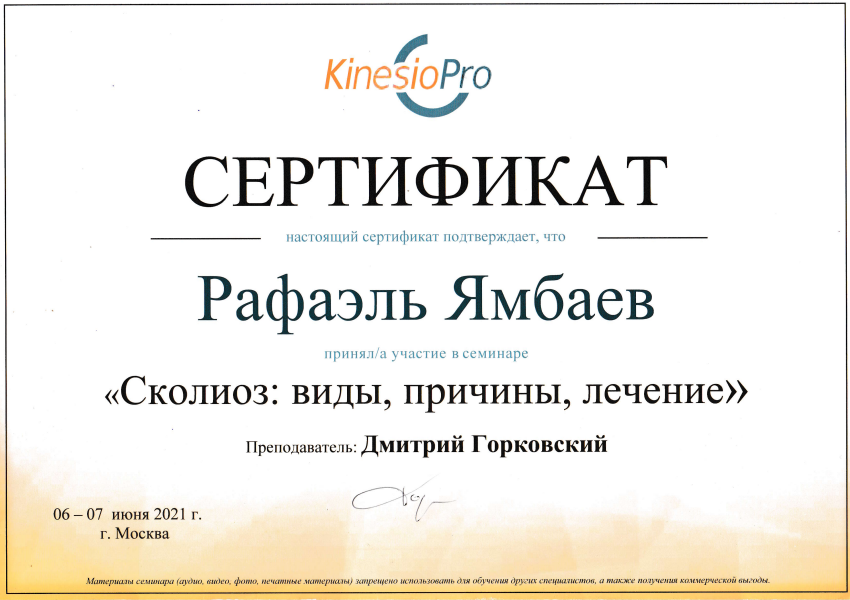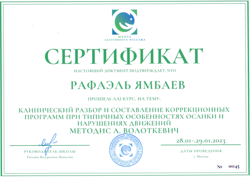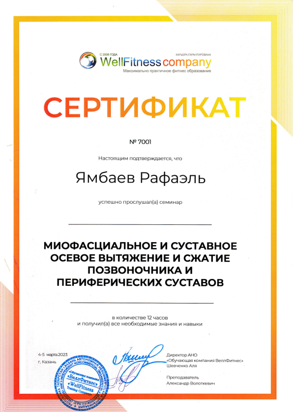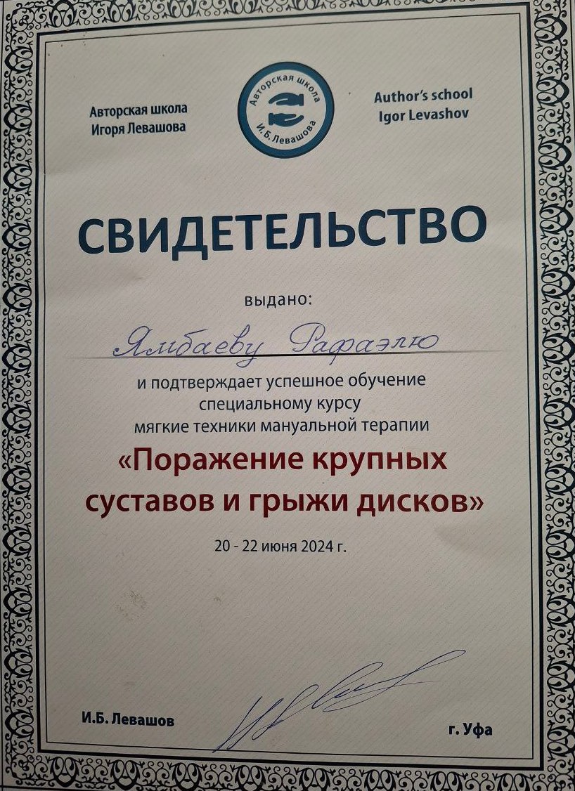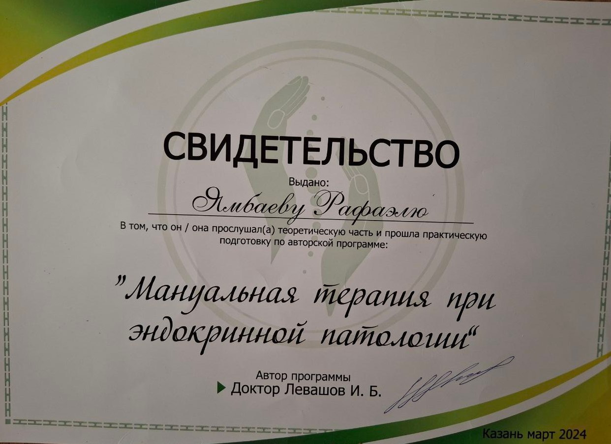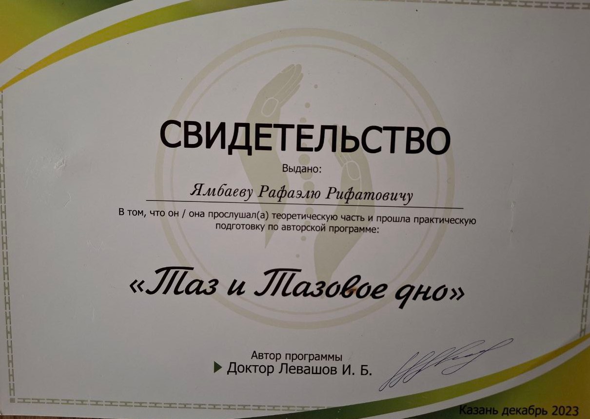 Моя,проблема была в изматывающей головной боли и руке. По снимкам мрт была протрузия в шее и сколиоз. Болела затылочная часть головы непрерывно. После долгих поисков приехала из Сургута в Казань на лечение к Ямбаеву Рафаэлю Рифатовичу. Приём длится долго 1. 5 часа, хочу отметить это тот врач который не гладит мышцы, а именно лечит. Облегчение настало сразу после первого приема. Ввиду насколько запущена моя ситуация по фиброзу мышц и никакое лечение до этого не помогало, надежды у меня было мало. А я прошла и курсы УВТ, магнитотерапии, лазер, различные блокады и радиочастотную аболяцию итак далее. То есть всё это мне просто не помогло. Огромная благодарность Рафаэлю Рифатовичу он просто врач от Бога. Спасибо большое! После первого сеанса боль в руке прошла сразу, голова перестала болеть после третьего сеанса. А я три года мучилась от этой болит.